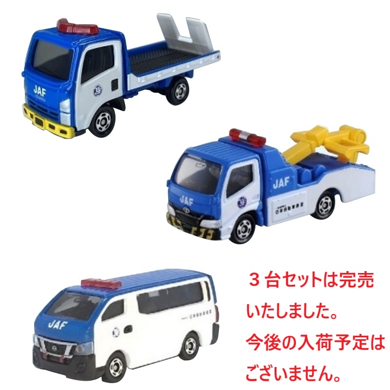 JAF通販紀行ECサイトで特別3台セットをGet!! JAFのイベント等で大人気のトミカ。新登場のいすゞエルフ車積載車と以前より人気のあるトヨタダイナレッカー車、日産キャラバンNV350多目的車を3台セットでお届けします。いずれも一般のお店では買えないJAFオリジナルモデルです。 ●全長(約):エルフ=7.6cm、ダイナ=7.3cm、キャラバン=7.8cm ●材質:本体=亜鉛合金、他 ●ベトナム製 ※お届けまでに約2週間ほどかかる場合があります。 ※お一人様3セット限りとさせていただきます。 ※当商品は、梱包送料400円を含んだ価格とさせていただいております。 ※不良品以外の返品・交換はお受けできません。 「トミカ」は株式会社タカラトミーの登録商標です。 (C)TOMY