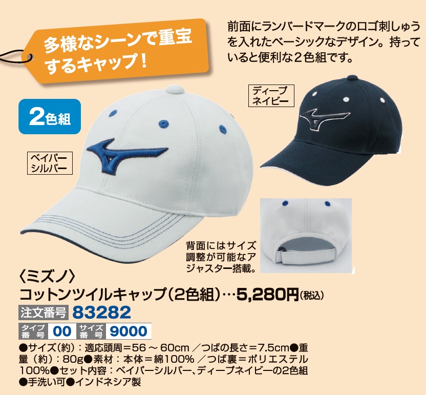 3. 〈ミズノ〉コットンツイルキャップ(2色組)