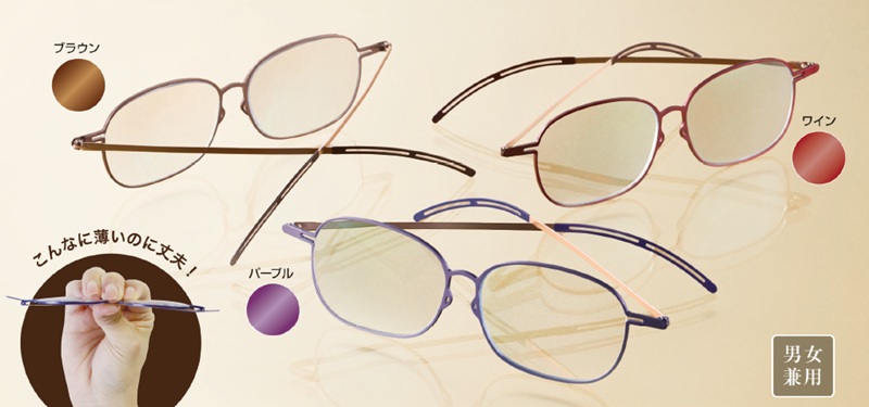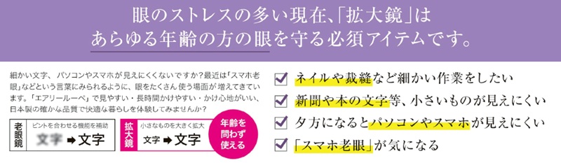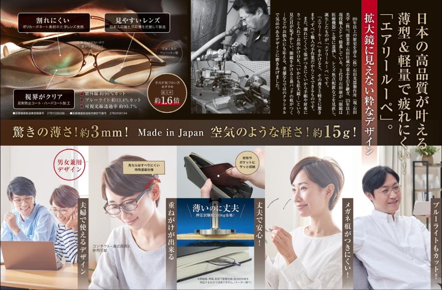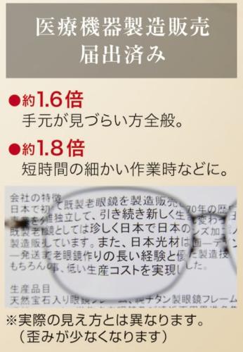 ●サイズ(約):幅13.5×高さ4×つるの長さ14.5cm ●重量(約):1.6倍=14g/1.8倍=15g ●材質:レンズ=ポリカーボネート/フレーム=ステンレス合金 ●医療機器製造販売届出番号:27B3X00134000082 ●日本製
