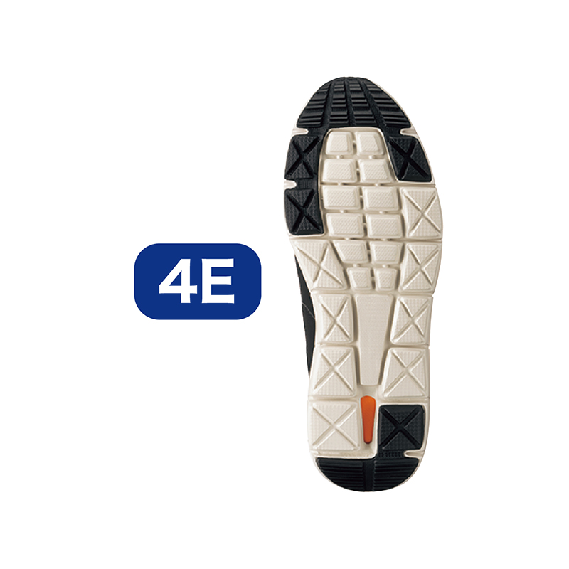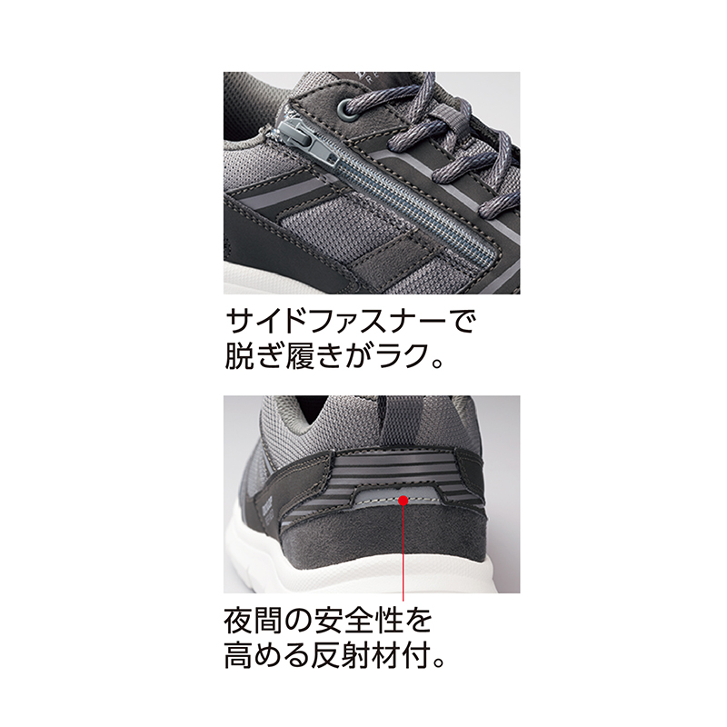 歩きやすくて、疲れにくい。快適仕様のウォーキングモデル。 通気性に優れたアッパーに、ソールは軽量で屈曲性のあるフレックス設計。クッション性が良く快適な履き心地を実現しました。踵部の衝撃吸収性が高く、歩行時のショックを和らげます。 ●ワイズ:4E ●重量(約):250g(25.5cm・片足) ●材質:アッパー=合成皮革、合成繊維/ソール=EVA、ラバー ●ベトナム製