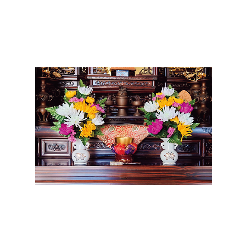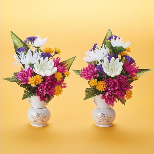いつまでも変わらない、仏様への供養の心を込めて。 仏花にふさわしい上品で華やかな花材を厳選し、生花と見まがうほどみずみずしい作品に仕上げました。水やり不要で衛生&経済的。光触媒加工により汚れなどが拭きとりやすく、手間いらずで美しさが続きます。 ●セット内容:仏花×2、瀬戸焼花器×2 ●サイズ(1点・約):仏花=幅26×高さ36×奥行18cm/花器=直径8×高さ12cm ●重量(1点・約):仏花=92g/花器=170g ●材質:仏花=ポリエステル(光触媒加工)/花器=陶器(瀬戸焼) ●仕様:花材=菊、糸菊、ラナンキュラス、スターチス、レザーファン ●日本製 ※商品の性格上、一点一点大きさ・色・形が異なります。 ※お届けまで約3週間かかる場合があります。