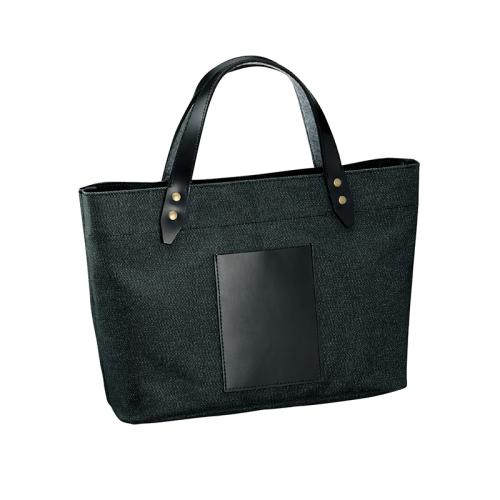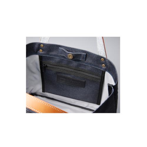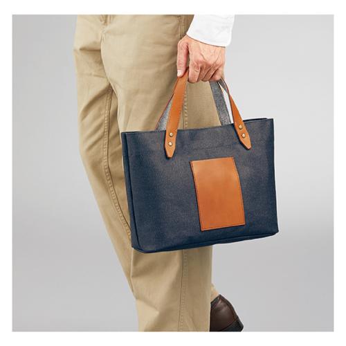 素材にこだわった大人のトート。実用的でサスティナブルな逸品。 残ったデニム生地や革の端材などの廃材が、おしゃれなバッグに。A4サイズもすっきり収まり、ビジネスにもデイリーユースにも大活躍です。●サイズ(外寸・約):幅(上部)37×高さ24×厚さ11cm/持ち手高さ=13cm ●重量(約):400g ●材質:本体=綿(PVCコーティング)/裏地=ポリエステル(帝人エコペット)/持ち手・前面ポケット・内ポケットワッペン=牛革 ●仕様:マグホック留めオープンメインコンパートメント(内部にファスナーポケット×1)/前面=オープンポケット×1 ●日本製