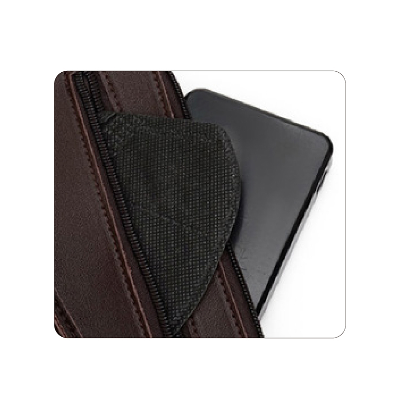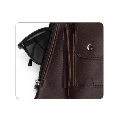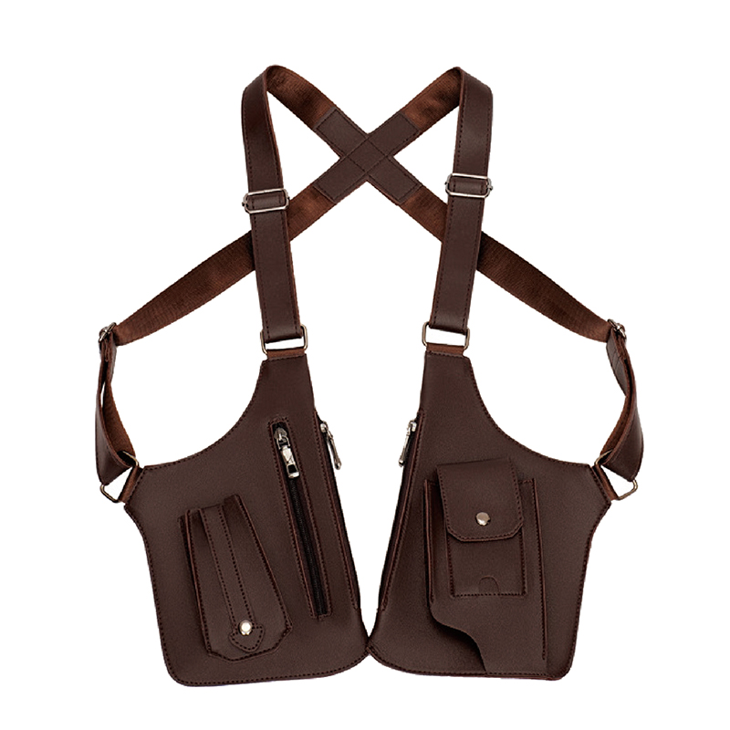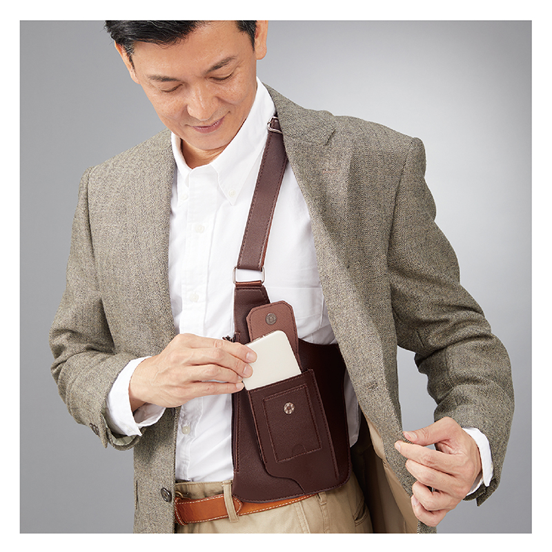 ガンマンスタイルで、両脇腹にフィット! 腕を通して肩に掛けるだけで装着完了。薄型ながら十分な収納力で、ハンズフリーに。旅行やお散歩にもおすすめです。 ●カラー:ブラウン ●サイズ(片側外寸・約):幅16×高さ18×厚さ2.5cm/ショルダーベルト長さ=26~46cm/収納可能スマートフォンサイズ=幅8×高さ16×厚さ0.8cm以内 ●重量(約):390g ●材質:本体・ショルダーベルト=合成皮革/本体内張=ポリエステル ●仕様:ファスナーポケット×3、オープンポケット×1、ホック式ポケット×2 ●中国製