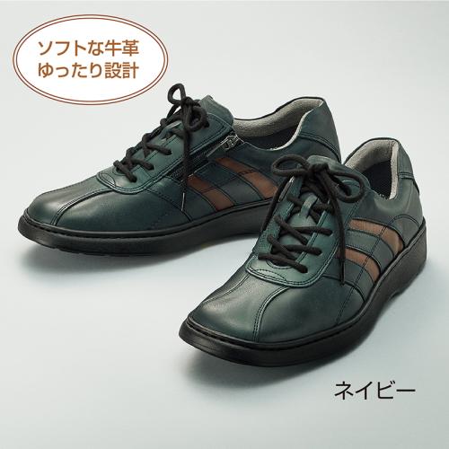 フィット感のよい袋縫い製法で、軽く快適な履き心地。 抗菌防臭+衝撃吸収性のある中敷を採用し、ニオイの軽減と快適歩行をサポート。アッパーはソフト牛革を使い、フィット感がありながらもゆったりした作りが魅力。落ち着いたデザインと履き心地は、日本製ならでは。日本人の足型に合わせて開発されたカジュアルシューズです。 ●ワイズ:4E ●重量(約):270g(25.0cm・片足) ●材質:アッパー=牛革(撥水加工)/ソール=発泡ラバー ●内側サイドファスナー付 ●日本製