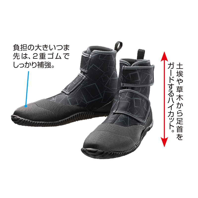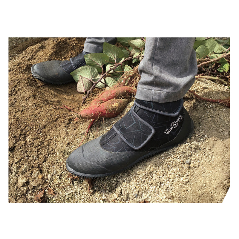 優れた動きやすさとフィット感。庭いじりや畑仕事をもっと楽しく! 軽くて柔らかいウエットスーツ素材で、しゃがみ込みの作業もラクラク。簡単着脱で、足首までスッポリ覆うハイカット仕様です。●カラー:ブラック ●ワイズ:E相当 ●重量(約):325g(M・片足) ●材質:アッパー=合成ゴム、ポリエステル、ナイロン、合成皮革、アクリル/インソール=EVA、ポリエステル/ソール=天然ゴム ●中国製