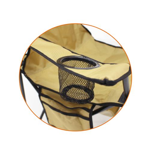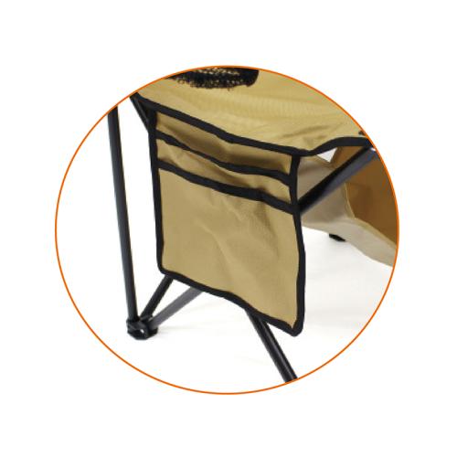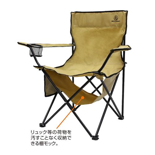 スマホも、荷物も、飲み物も。1つですっきり!万能チェア。 サイドポケットや座面下の棚モックなど、荷物を地面に置くことなくすっきり収納。肘掛けにはドリンクホルダーもあり、いつでも気軽にアウトドアレジャーを楽しめます。 ●カラー:サンドベージュ ●サイズ(外寸・約):イス使用時=幅82×奥行51×高さ80cm/座面の高さ=36cm/収納時=幅14×奥行14×高さ84cm ●重量(約):2.3kg ●耐荷重(約):座面=80kg /棚モック=2kg ●材質:構造部材=鋼(表面加工:エポキシ樹脂塗装)/張り材=ポリエステル/クッション材・背部・ひじ掛け部=ウレタンフォーム ●専用収納袋付 ●中国製