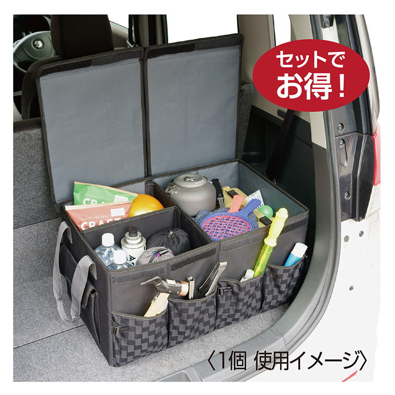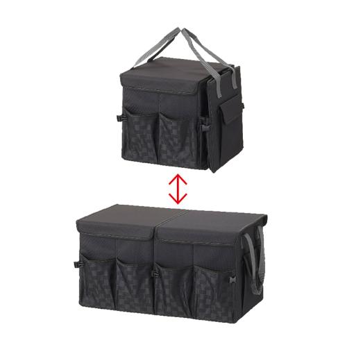 車内の荷物を、まとめて整頓。フタ付で見た目すっきり。 トランクや車内の小物をすっきり収納できるフタ付BOX。整理しやすい仕切り板や小物の収納に便利なポケット、2Lペットボトルが縦に入る高さも嬉しいポイントです。持ち手付で、荷物を入れたままの持ち運びもOK! ●カラー:ブラック ●サイズ(外寸・約):全面使用時=幅62×奥行39.5×高さ33cm/片面折りたたみ使用時=幅30×奥行39.5×高さ33cm/収納時=幅39.5×高さ32×厚さ12cm/持ち手高さ=23cm ●重量(1個・約):2.1kg ●材質:ポリエステル ●仕様:(全面使用時)前面= オープンポケット×8/側面=面ファスナー留めかぶせポケット×2 ●セット内容:本体、フタ×2、仕切板×2、底板×1 ●中国製