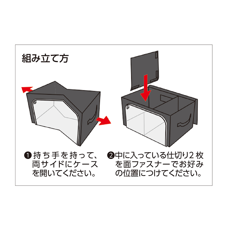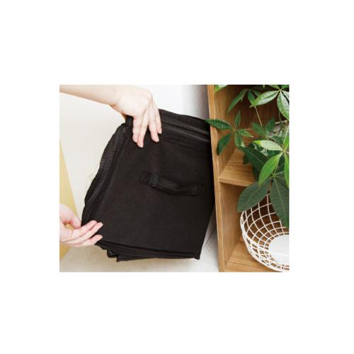 衣替えシーズン! 上から入れて前から取り出す。かさばる衣類も上手に整理! 夏物から冬物まで上手に収納できる衣類ケース。透明窓で中身が確認できるので、必要なものをサッと取り出せます。かさばる衣類の収納時には高さを約5cmアップできます。 ●カラー:ブラック ●サイズ(約):幅58×奥行36×高さ32~37cm ●重量(約):780g(1個) ●材質:本体=ポリプロピレン/窓=EVA/中芯=紙 ●耐荷重(約):3kg ●仕様:竹炭シート入り仕切り×2(着脱可) ●中国製