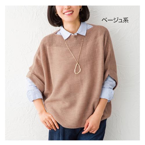 シルエットがゆるやかでやさしい。ボディーラインのカバー効果も。 フェミニンなラインが魅力的なドルマンスリーブのプルオーバー。折り返した袖口や編地を切り替えたデザインに大人っぽいお洒落センスが。やわらかニットで着心地も良好です。ブラウスなどとも合わせやすく、これからの季節に出番が増えそう。●素材:アクリル95%、毛5% ●手洗い可 ●日本製 ※インナー、アクセサリーは付属しません。