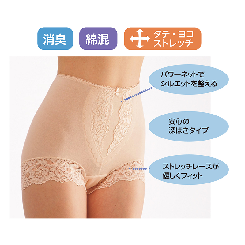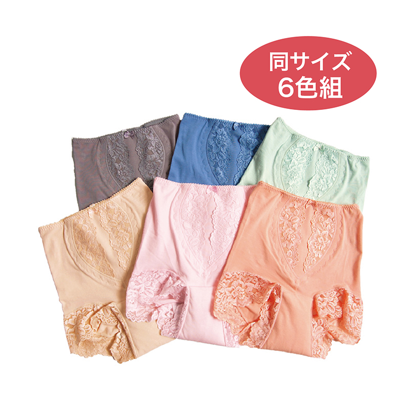 こう見えて大型パッドと消臭機能を備える。ぽっこりシルエットをすっきり見せる効果も。 レースをあしらったデザインがエレガントで、傍目にはわからない尿もれ対策ショーツです。お腹まですっぽりの深ばきタイプでシルエットすっきり。同系色で目立ちにくい大型吸水パッドと消臭機能で、長時間安心して過ごせます。 ●素材:本体=綿95%、ポリウレタン5%/レース部分・パワーネット部分=ナイロン、ポリウレタン ●仕様:吸水量=約30cc ●洗濯機可(ネット使用) ●セット内容:グレー、ブルー、グリーン、ベージュ、ピンク、オレンジの同サイズ6色組 ●中国製 ※衛生商品のため、開封後の返品・交換はお受けできません。