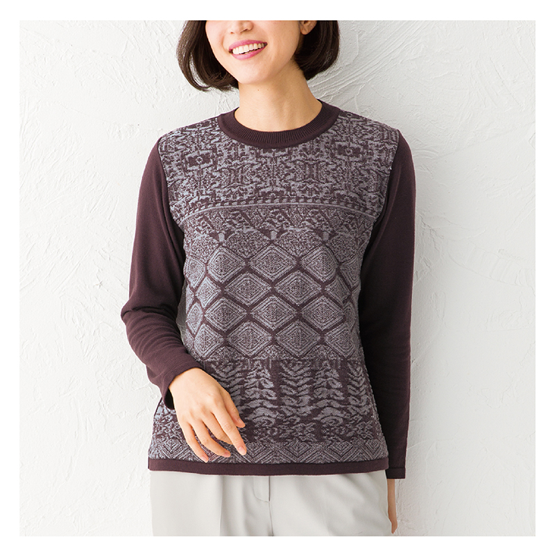 シックな秋色に包まれて。大人の上品さが際立ちます。 前身頃に表情豊かな柄編みを施した、大人顔のプルオーバー。無地と柄を組み合わせ、シルエットに美しいメリハリ。ウール混素材で暖かく。 ●カラー:ボルドー×グレー系 ●素材:アクリル60%、毛40% ●手洗い可 ●日本製 ※商品の性格上、一点一点色や柄の出方等が多少異なります。