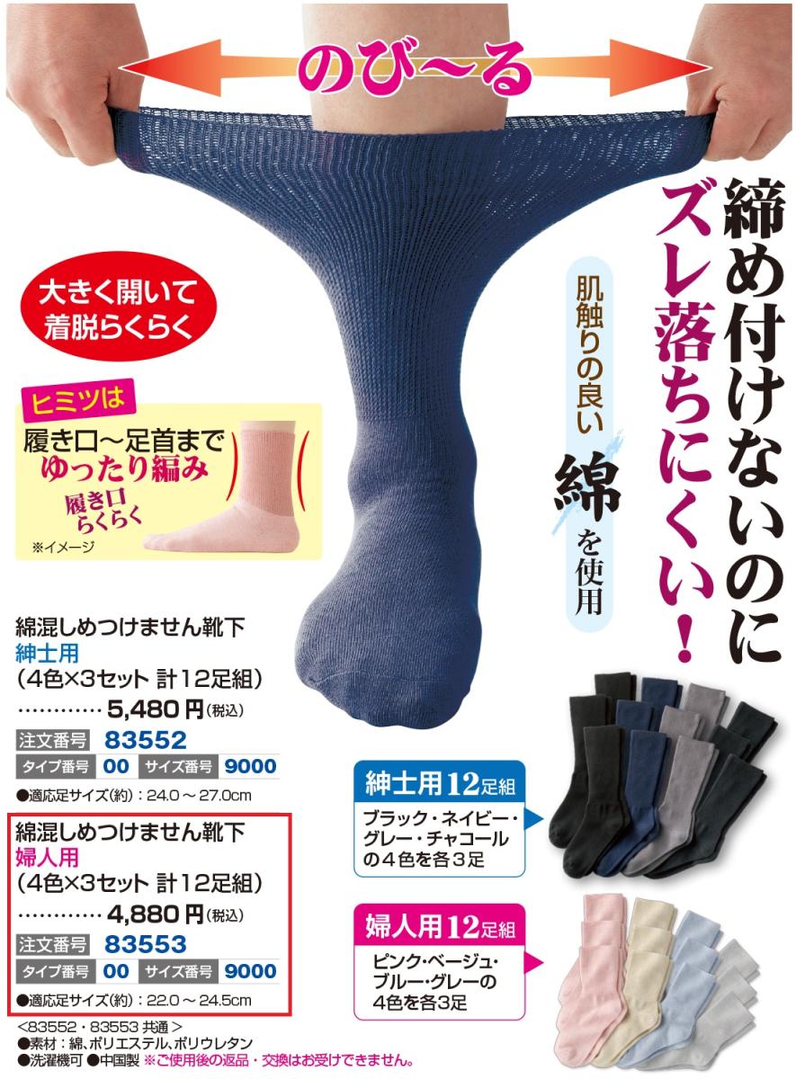 3. 綿混しめつけません靴下 婦人用(4色×3セット計12足組)