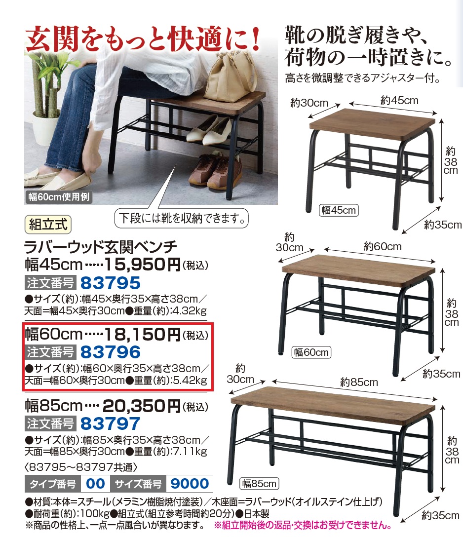 3. ラバーウッド玄関ベンチ 幅60cm