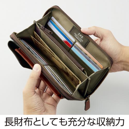 財布とスマホケースが一体化。手ぶらで外出を応援。 本革特有の風合いも魅力。鞄の街・豊岡の職人が丁寧に仕上げました。 ●カラー:ブラウン ●サイズ(外寸・約):幅12×高さ21×厚さ5cm/ショルダーベルト長さ=78~137cm(着脱可) ●重量(約):330g ●材質:本体=牛革、他/ショルダーベルト=綿 ●仕様:札入れ×2、小銭入れ×1、カード入れ×12/前面=マグネット付フラップポケット×1 ●日本製