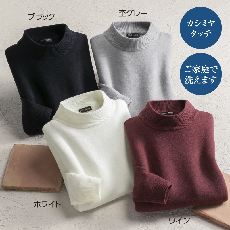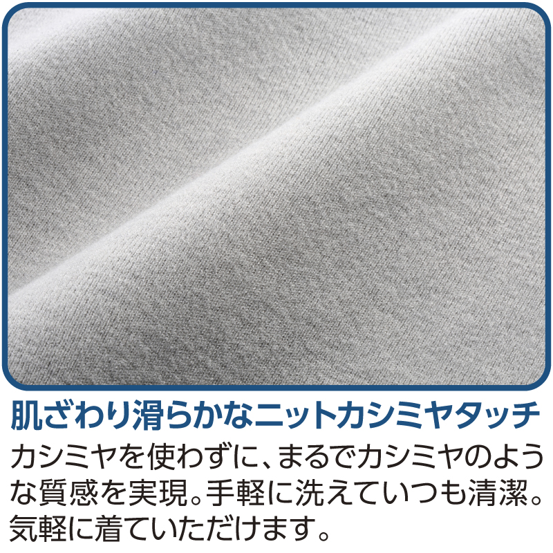 まるでカシミヤのような滑らかさ。 肌ざわり滑らかなニットカシミヤタッチ カシミヤを使わずに、まるでカシミヤのような質感を実現。手軽に洗えていつも清潔。気軽に着ていただけます。 ●素材:アクリル100% ●洗濯機可(ネット使用) ●中国製