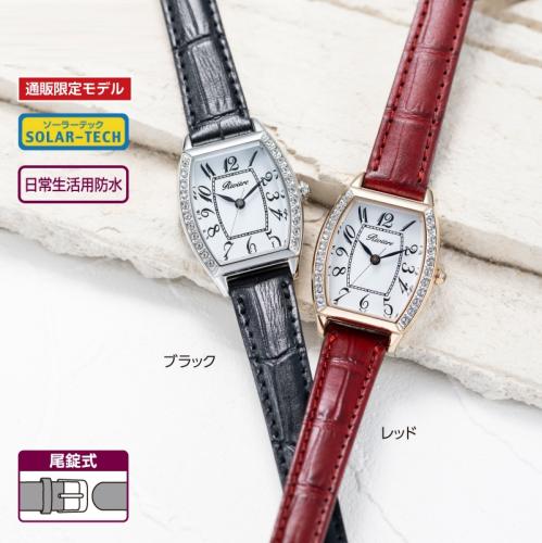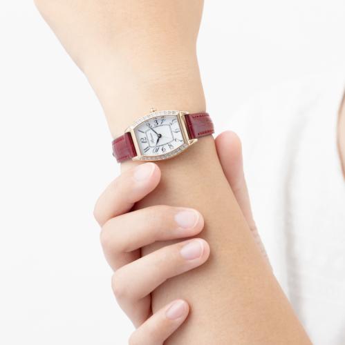 手元を優雅に彩る洗練のデザイン。 トノー型ケースラインが印象的。電池交換不要のソーラー発電です。 ●サイズ(約):ケース=縦26.1×横23.5×厚さ7.83mm/適応手首周り=13~17cm ●重量(約):19g ●材質:ケース=ステンレス(クリスタルガラス付)/風防=クリスタルガラス/ベルト=牛革(カーフ) ●仕様:日本製ソーラークォーツムーブメント、平均月差±15秒、5気圧防水、フル充電時より約6カ月可動 ●機能:過充電防止機能、充電警告機能 ●留め具:尾錠式 ●キャリバーナンバー:E031 ●中国またはタイ製