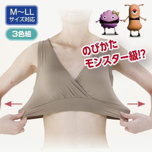 グーンと伸びてバストにフィット。サイズ選びの悩みを解消! モンスター級に伸縮する素材を使用することで、驚きのフィット感を実現。MからLLサイズまでワンサイズで、締め付け感なく気持ちよく着用いただけます。ソフトな肌ざわりも自慢です。●サイズ(約):適応胸囲79~101cm ●素材:ナイロン80%、ポリウレタン20% ●仕様:挿入丸パッド、ホックなし ●セット内容:ペールブラウン、マルシェピンク、ブラックの3色組 ●洗濯機可(ネット使用) ●中国製 ※衛生商品のため、開封後の返品・交換はお受けできません。