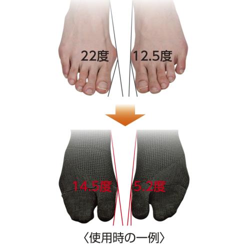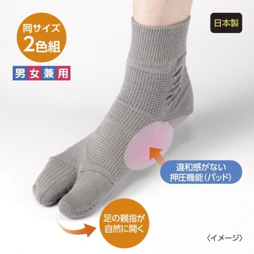 複数の特殊な編み方で、親指が自然に開く。 広島大学大学院と共同開発。特殊編みの組み合わせで親指を動かしやすくする設計。一日履いていても楽。そのまま靴が履けます。 ●素材:綿、ナイロン、ポリウレタン、他 ●セット内容:ブラック、グレーの同サイズ2色組 ●手洗い可 ●日本製 ※ご使用後の返品・交換はお受けできません。