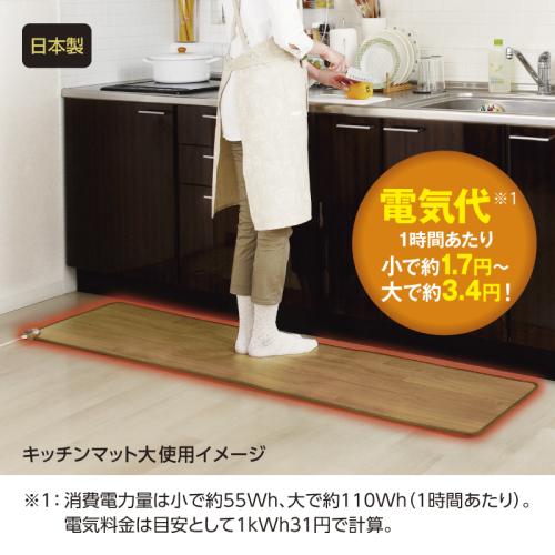敷くだけで床暖房感覚。もうスリッパを履かなくても寒くない。 床になじむフローリング調。キッチンで足元を暖めます。●カラー:ナチュラル ●サイズ(約):縦45×横90cm ●重量(約):900g ●材質:表地=PVC/裏地=ポリエステル ●電源コード長さ(約):1.8m ●電源:AC100V ●消費電力:100W ●表面温度(約):45℃ ●サーモスタット式 ●日本製 ※1標準消費電力量は標準品を非使用状態にして測定した値です。 ※ご使用後の返品・交換はお受けできません。 ※お届けまで約2週間かかる場合があります。