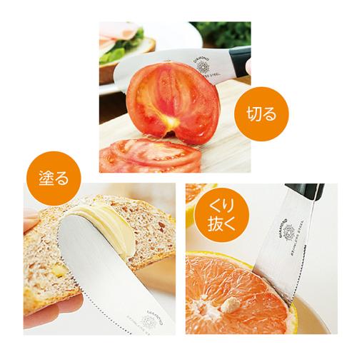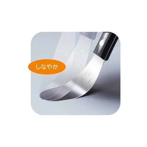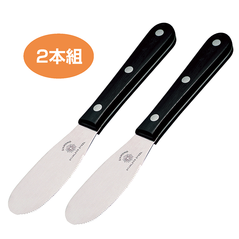 朝食に、アウトドアに、このナイフは手放せません。 ステーキやフランスパンに使えば、切れ味に驚くはず。オレンジをくり抜くのは朝飯前。バターやジャムを塗るのも得意技です。薄くて使いやすいヘラナイフがテーブルの上で多彩に活躍します。 ●サイズ(約):幅3.3×全長21cm/刃部=9cm ●重量(1本・約):70g ●材質:金属部=ハイカーボンステンレス鋼/柄部=積層強化木 ●日本製 ※ご使用後の返品・交換はお受けできません。