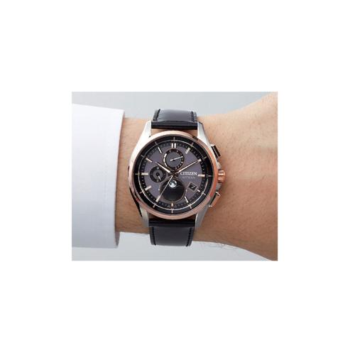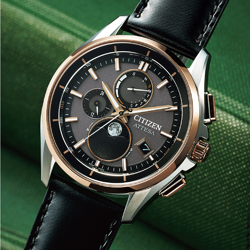 アナログ式光発電腕時計で世界初※、月齢自動計算機能「ルナプログラム」搭載。※2023年8月時点。シチズン時計調べ。 〈シチズン〉アテッサから、キャリバーを一新し世界初の機能「ルナプログラム」を搭載した、ムーンフェイズが登場です。星空の中に美しく輝く銀色の月を表現したムーンフェイズ部分が、スポーティ―さを残しつつもエレガントな印象のデザインに溶け込み、いままでにない個性を発揮。さまざまなシーンで魅力的な存在感をアピールします。 ●サイズ(約):ケース=直径41.5×厚さ10.8mm/適応手首周り=最大22cm ●重量(約):59g ●材質:ケース=スーパーチタニウム(デュラテクトチタンカーバイト=シルバー色、デュラテクトピンク=ピンクゴールド色)/ベルト=牛革/風防=サファイアガラス(無反射コーティング) ●仕様:日本製クォーツムーブメント、平均月差±15秒(電波非受信時)、10気圧防水、光発電方式(フル充電時約2.5年可動・パワーセーブ作動時)、パワーセーブ機能、充電量表示機能、充電警告機能、過充電防止機能、日中米欧電波受信機能、受信局自動選択機能、定時受信機能、強制受信機能、パーペチュアルカレンダー、デイ&デイト表示、24時間表示、ダイレクトフライト、ワールドタイム機能(24時差)、サマータイム機能、パーフェックスマルチ3000(JIS1種耐磁、衝撃検知機能、針自動補正機能、世界4エリア受信)、ムーンフェイズ機能、月齢自動計算機能、北・南半球月齢表示切替機能、夜光(針+インデックス) ●留め具:三つ折れプッシュ式 ●キャリバーナンバー:H874 ●日本製 ※一部電波の入りにくい場所(室内、ビルなど)や環境(曇天、雨天など)があります。