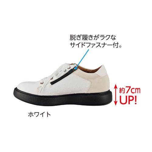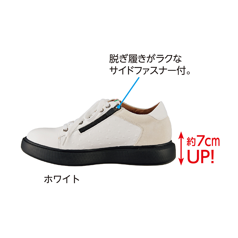 約7cmアップ! オーストリッチ調型押しがおしゃれ。 オーストリッチ調型押しが映える、スタイルアップスニーカー。約3cmアップのインソールに、ヒールと合わせると約7cmアップ。サイドファスナーで脱ぎ履きも簡単です。 ●外見ヒール高さ(約):4cm ●ワイズ:3E ●重量(約):400g(26.0cm・片足) ●材質:アッパー=合成皮革、牛革スウェード/ソール=発泡ラバー ●仕様(約):3cmアップインヒール ●日本製 ※ご使用時の身長の変化は体重によって多少の差が生じます。