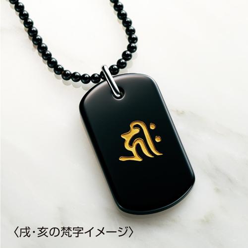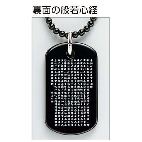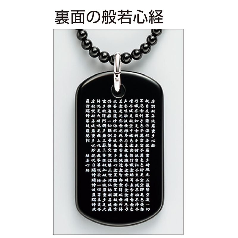 ブラックオニキスに守護本尊と般若心経で心願成就・災難除去。 邪念を祓い厄を除けると伝えられるブラックオニキス。その表面に守護本尊の梵字を、裏面に般若心経を刻印しました。チェーンもブラックオニキスを使用しています。 ●サイズ(約):トップ=縦4.4×横2.4×厚さ0.4cm/ネックレス長さ=50cm ●重量(約):19g(ネックレス含む) ●材質:トップ=ブラックオニキス/ネックレス=3mm珠ブラックオニキス/留め具・バチカン=シルバー925 ●留め具:引き輪式 ●日本製 ※商品の性格上、一点一点風合い等が異なる場合があります。 ※裏面の般若心経はどのタイプも共通となります。 ※お届けまで約2週間かかる場合があります。