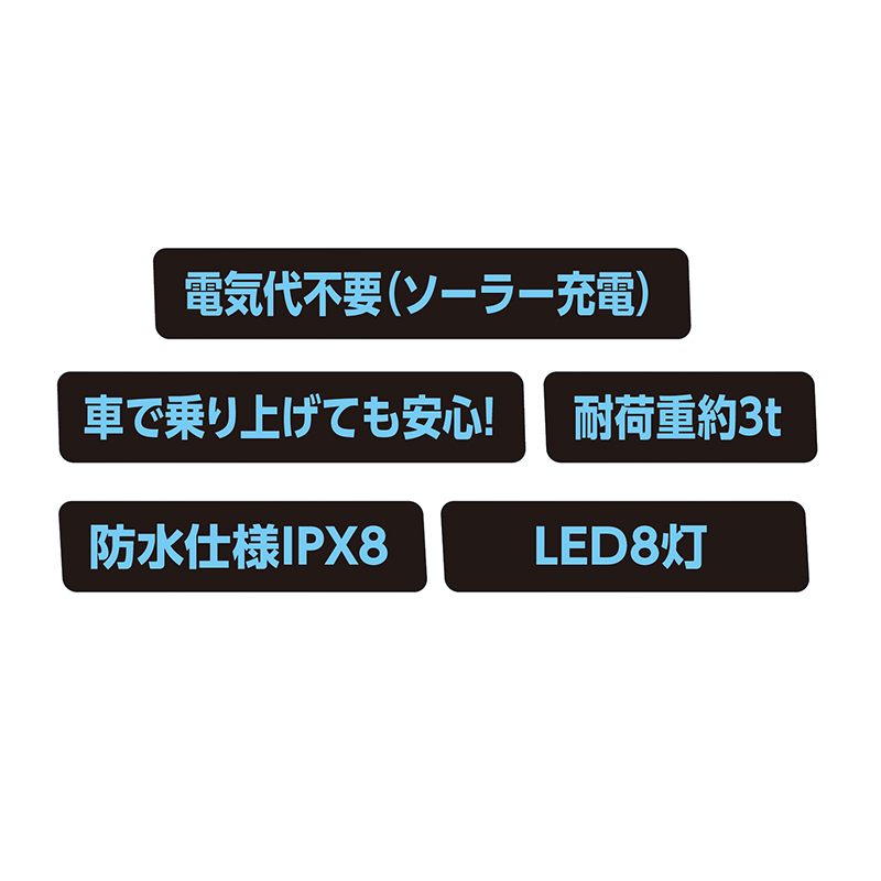 夜のガレージをおしゃれに演出。駐車も誘導するLEDマーカー。 LED8灯を昼間にソーラーパネルで充電、夜間には自動で点灯します。夜間のバック駐車をまっすぐに誘導し、ガレージをおしゃれに演出。発光色は白と暖白から、ガレージの雰囲気に合わせて選択できます。 ●サイズ(外寸・約):本体=直径12.3×高さ2.3cm/ソーラーパネル=縦5.8×横5.8cm ●重量(1個・約):165g ●耐荷重(1個・約):3t ●材質:フレーム=アルミニウム合金/カバー=ポリカーボネート/ベース=ABS樹脂 ●電源:ニッケル水素電池1200mAh ●充電時間(約):8時間 ●連続点灯時間(約):30時間 ●仕様:夜間に自動点灯、光充電(2V、250mA、0.5W)、LED×8(明るさ最大48ルーメン)、発光色選択可(白・暖白)、高輝度再帰性反射材、防水(IPX8) ●付属品:粗面用両面テープ ●中国製 ※ご使用後の返品・交換はお受けできません。