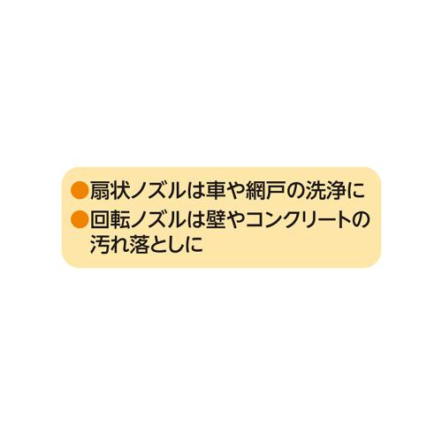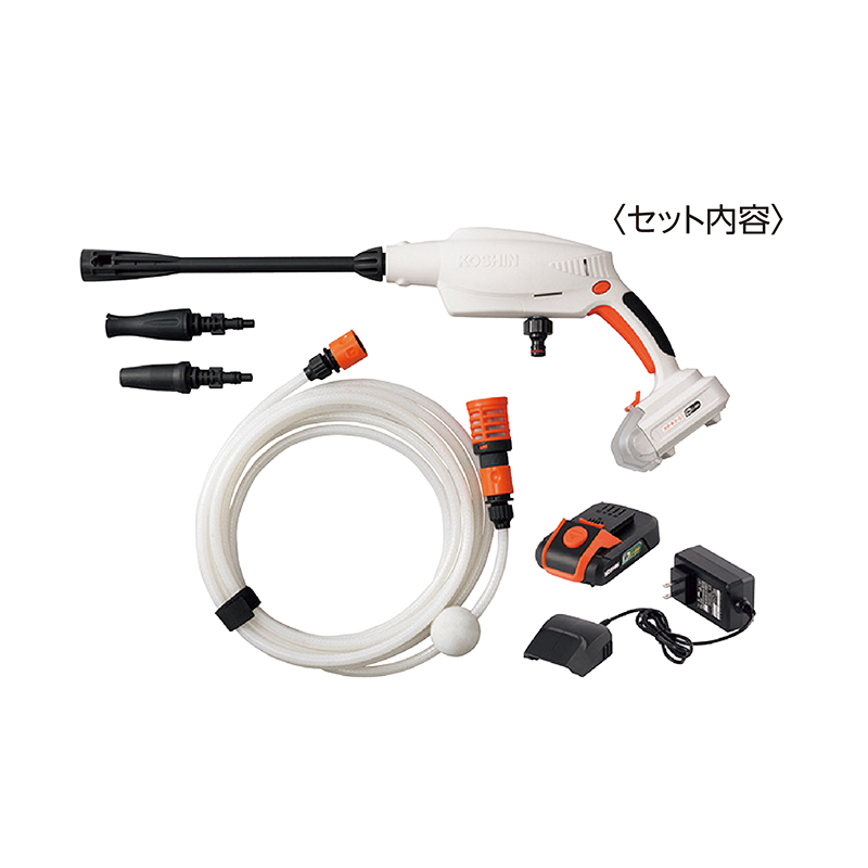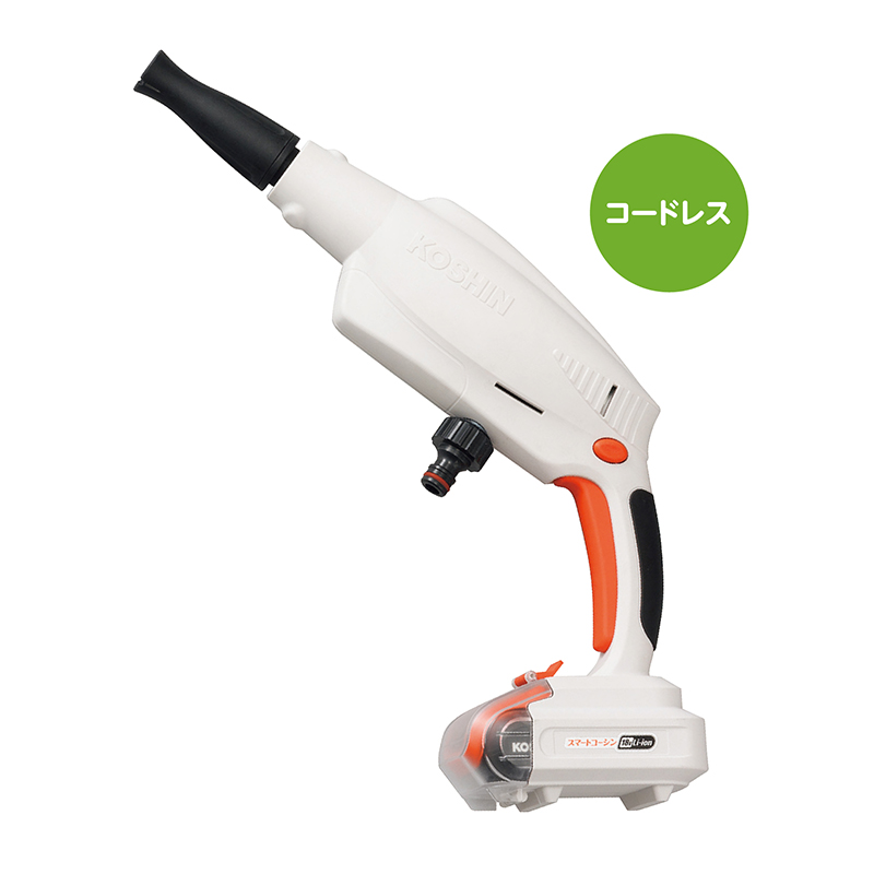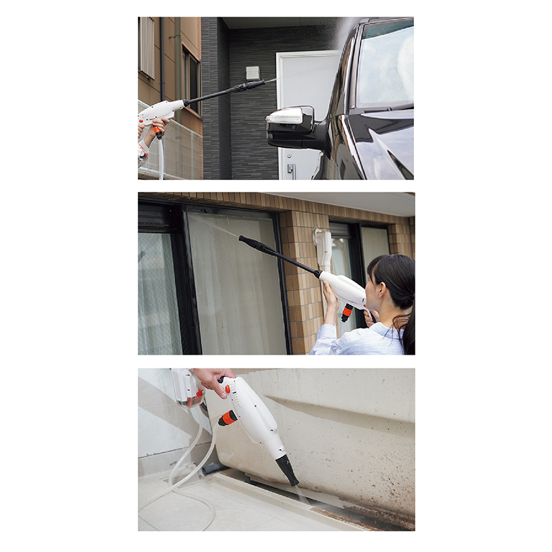 水道と電源のない場所でも手軽にお掃除。コードレスタイプの小型洗浄機。 コードレスで電源要らず。バケツの水を用意すれば、水道のない場所で使えて便利。わずか約2.4㎏と軽量で扱いやすく、2.2MPa(扇状ノズル)のパワーで効率よくお掃除できます。 ●カラー:ホワイト ●サイズ(本体・約):本体=幅9×奥行36.5×高さ26.2cm/ホース長さ=6m ●セット重量(約):2.4kg ●材質:アルミニウム合金、TPE、ニトリルゴム、他 ●電源:18Vリチウムイオンバッテリー ●充電時間(約):60分 ●連続使用時間(満充電時・約):扇状ノズル=13分/回転ノズル=14分 ●仕様(約):吐出圧力(約)=扇状ノズル2.2MPa、回転ノズル2.1MPa/最大吐出水量=約2L/分/騒音値=約74dB ●セット内容:本体、専用バッテリー、急速充電器、吸水ホース、延長パイプ、扇状ノズル、回転ノズル、専用バッグ ●中国製 ※ご使用後の返品・交換はお受けできません。