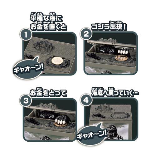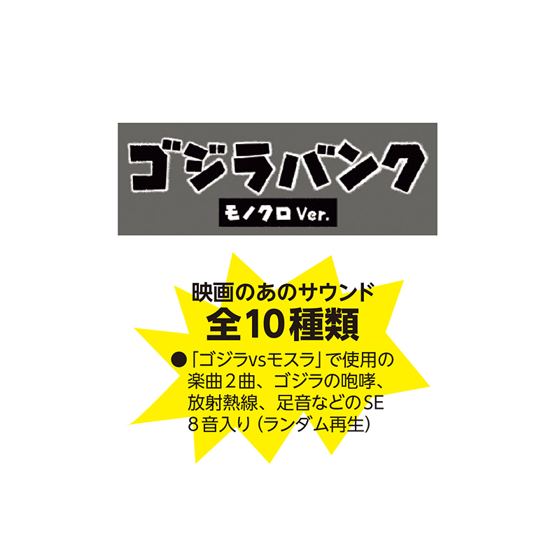 モノトーンでさらに高まる迫力! ゴジラが現れ、コインを奪います。 ゴジラがサウンドとともに現れ、硬貨を奪取! 500円硬貨で約40枚、20000円を貯金できます。キャッシュレスの時代だからこそ、硬貨を手にしたら、楽しく貯金を。貯まったら、裏蓋を開けて取り出せます。●サイズ(外寸・約):幅12×奥行10×高さ10.6cm ●重量(約):376g ●材質: ABS樹脂、SEBS樹脂、POM樹脂、他 ●電源:単三形アルカリ乾電池×2(別) ●対象年齢:6歳以上 ●中国製
