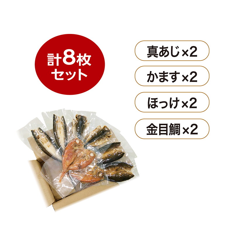 仲卸の老舗「豊洲内長」がお勧めの、格別な味がいただけます。 国産の干物を直火と遠赤外線で焼き上げ、真空パックにしました。そのままでも召し上がれますが、電子レンジや湯せんで温めるとさらに美味しくいただけます。 ●セット内容:真あじ(約70g×2)、かます(約57g×2)、ほっけ(約70g×2)、金目鯛(約120g×2)の計8枚セット ●賞味期間(約):常温保存で90日 ●特定原材料等:なし ●国内製造 ※魚の開き方は多少異なる場合があります。 ※お届けまで約2週間かかる場合があります。 ※商品の性格上、出荷後のキャンセル及び返品・交換はお受けできません。