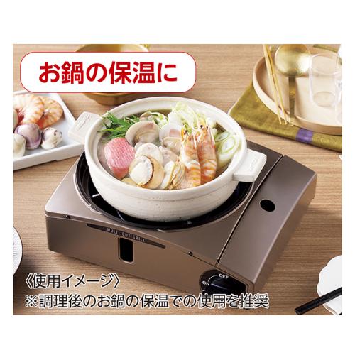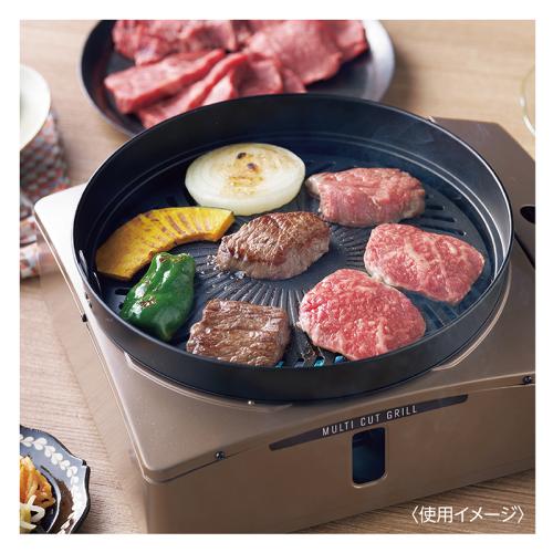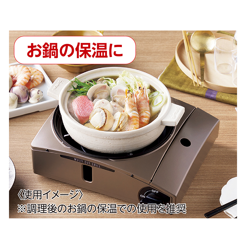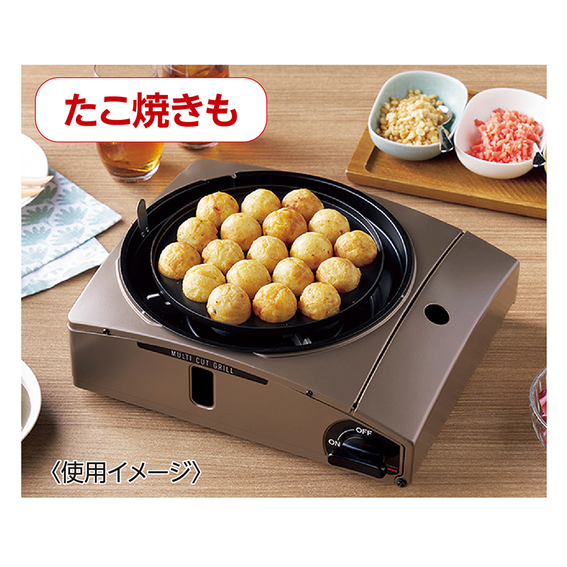 煙と油はねをダブルでしっかり抑えます! 焼肉も、たこ焼きも、お鍋も楽しめる多機能グリル。 煙だけでなく、油はねも軽減する、進化したマルチカット構造。プレート表面温度を約210~250度に保ち、高温化を防ぐ構造で、肉の脂の煙化を抑制します。取り外し可能なリングを装着すれば、油はねも大幅にカットします。 ●カラー:ブラウンゴールド ●サイズ(外寸・約):幅31.9×奥行27.9×高さ14.4cm ●重量(約):焼き肉プレート搭載時(リングあり)=2.1㎏ ●材質: 鋼板(粉体塗装)、アルミダイキャスト(フッ素樹脂加工)、耐熱アルミダイキャスト、ABS樹脂、他 ●最大発熱量:1.0kW(900kcal/h) ●連続燃焼時間(約):標準使用時=213分 ●仕様:圧電点火方式、圧力感知安全装置、マグネット式カセットボンベ着脱 ●付属品:焼肉プレート×2、たこ焼きプレート、プレート用取っ手 ●日本製 ※イワタニカセットガスをご使用ください。 ※鍋は付属しません。 ※使用できる鍋の大きさは、鍋底直径が約10~18cm、内径が約20cmまでです。 ※ご使用後の返品・交換はお受けできません。