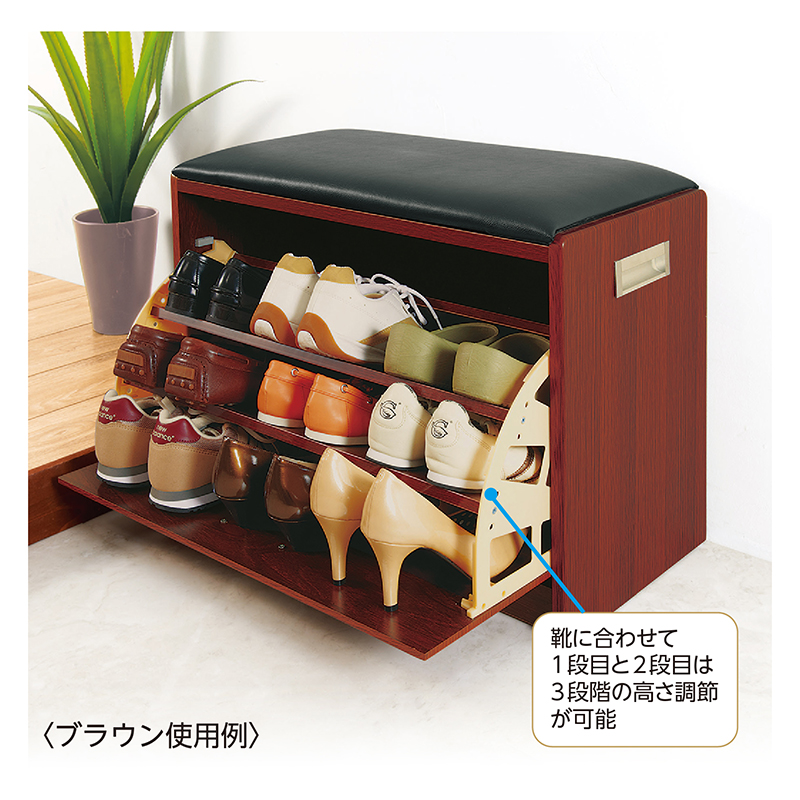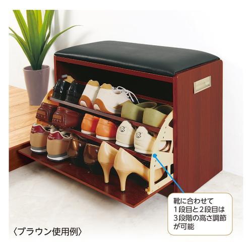 座れるから、玄関で靴の脱ぎ履きが楽々! ベンチタイプのシューズボックスです。 玄関で腰かけて、靴の脱ぎ履きができたら。靴の収納を増やしたい。そこで、座れるシューズBOXです。フラップタイプで靴が取り出しやすく、靴や小物をすっきり収納。玄関まわりが快適になります。 ●サイズ(外寸・約):幅64×奥行31×高さ46cm ●重量(約):12kg ●最大収納足数(約):9足 ●耐荷重(約):80㎏ ●材質:本体=パーティクルボード(メラミンシート加工)、MDF(PVCシート加工)、アルミニウム合金、亜鉛合金、ポリエチレン、スチール/張地=ポリウレタン/クッション材=ウレタン ●完成品 ●中国製 ※お届けまで約2週間かかる場合があります。