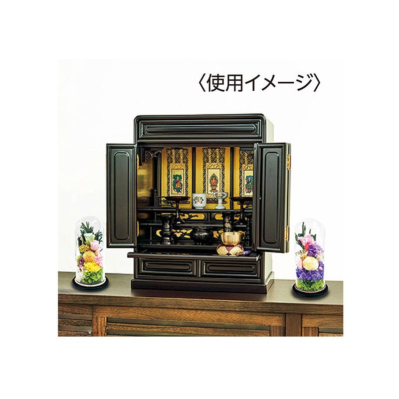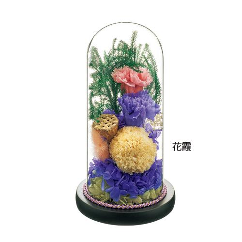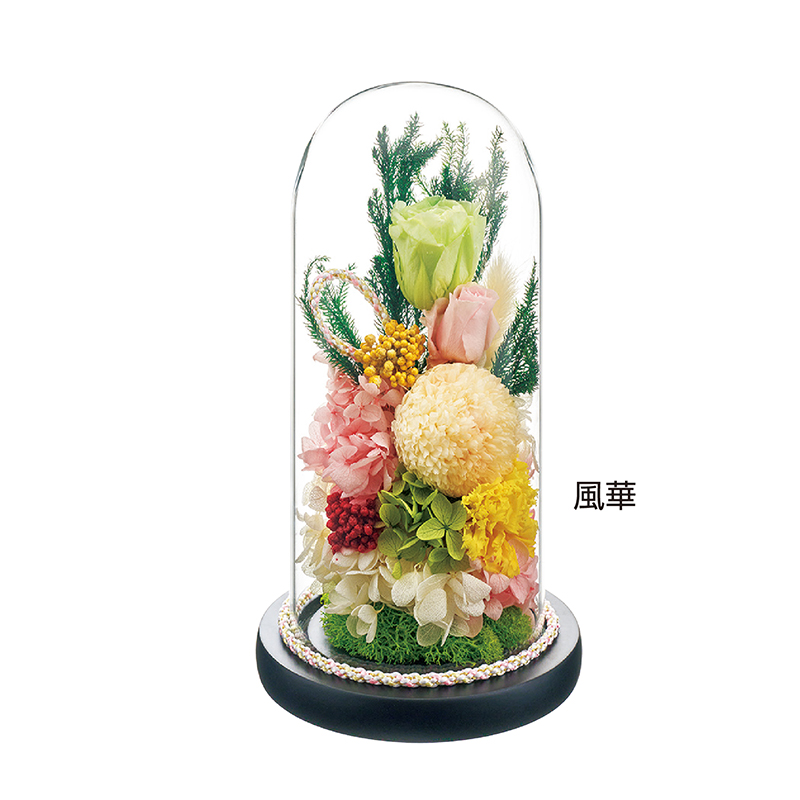 ほこりがつかず、お手入れ簡単。ガラスドーム入りの仏花。 生花に特殊な加工を施したプリザーブドフラワーとドライフラワーを使用。ガラスドーム入りなので、美しい色合いと質感がより長持ちし、手間いらずで仏前を長く美しく彩ります。 ●サイズ(約):直径11.5×高さ21.5cm ●重量(約):350g ●材質:風華=[プリザーブドフラワー]バラ、ライスフラワー、カズラ、カーネーション、ピンポンマム、アジサイ[ドライフラワー]ラグラス/花霞=[プリザーブドフラワー]カズラ、カーネーション、ピンポンマム、アジサイ[ドライフラワー]ラグラス、ハスの実、カスミソウ、ボタンフラワー/花器=ガラス ●中国製 ※商品の性格上、一点一点花の大きさ、色、形等が異なります。 ※一部花材が変更になる場合があります。