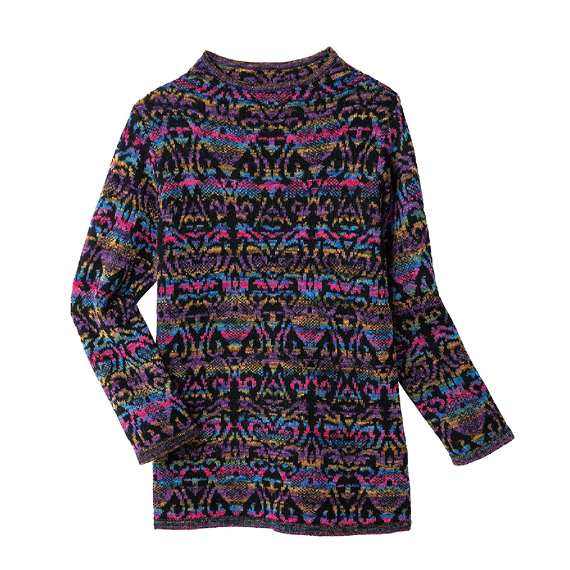 一枚で艶やかスタイリング。華やかに装うニットチュニック。 ウールと綿の交撚糸(こうねんし)を使った、表情豊かなニットチュニック。かすり糸の色使いが映えるジャカード編みで華やかに。首まわりはボトルネックで暖かくカバーして、秋をエレガントに着こなせます。 ●カラー:ネイビー系 ●素材:毛34%、アクリル26%、綿25%、ナイロン15% ●ドライクリーニング可 ●日本製 ※アクセサリーは付属しません。 ※商品の性格上、一点一点柄の出方が異なります。