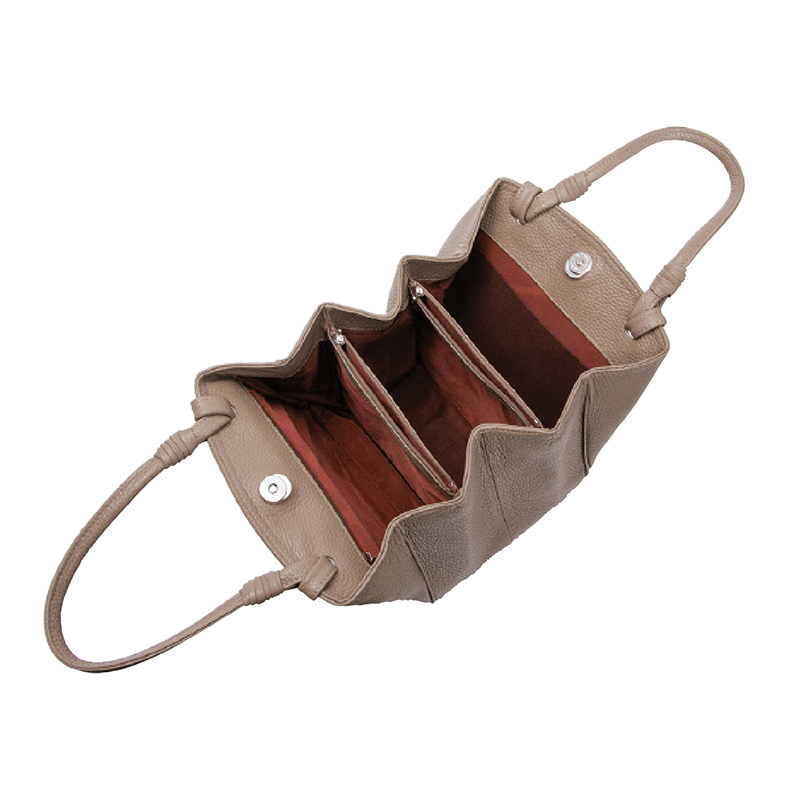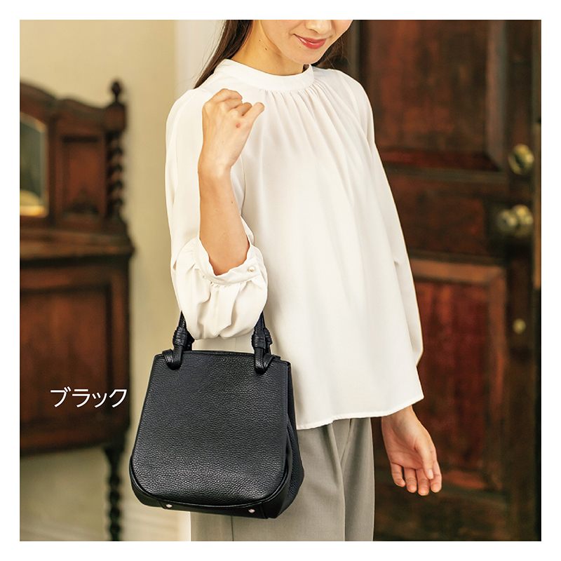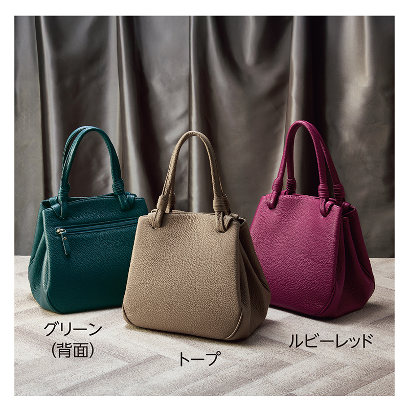 見やすく、使いやすく、美しく。大人の女性のエレガントバッグ。 上質で発色の良いイタリアンレザーを採用。丸みのあるスクエアタイプで、コロンとかわいらしいデザインです。マグネットホック留めのメインコンパートメントは大きく開き、見やすく、取り出しやすく。持ち手の革巻きがアクセントになったエレガントなバッグです。 ●サイズ(外寸・約):最大幅23×高さ22×厚さ16.5cm/持ち手高さ=14cm ●重量(約):510g ●材質:表地・持ち手=牛革/裏地=レーヨン ●仕様:マグネットホック留めオープンメインコンパートメント(内部に仕切りを兼ねたファスナーポケット×2、ファスナーポケット×1、オープンポケット×1)/背面=ファスナーポケット×1/底鋲×4 ●日本製
