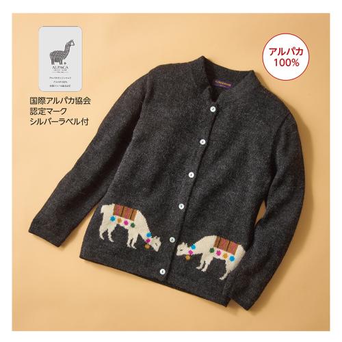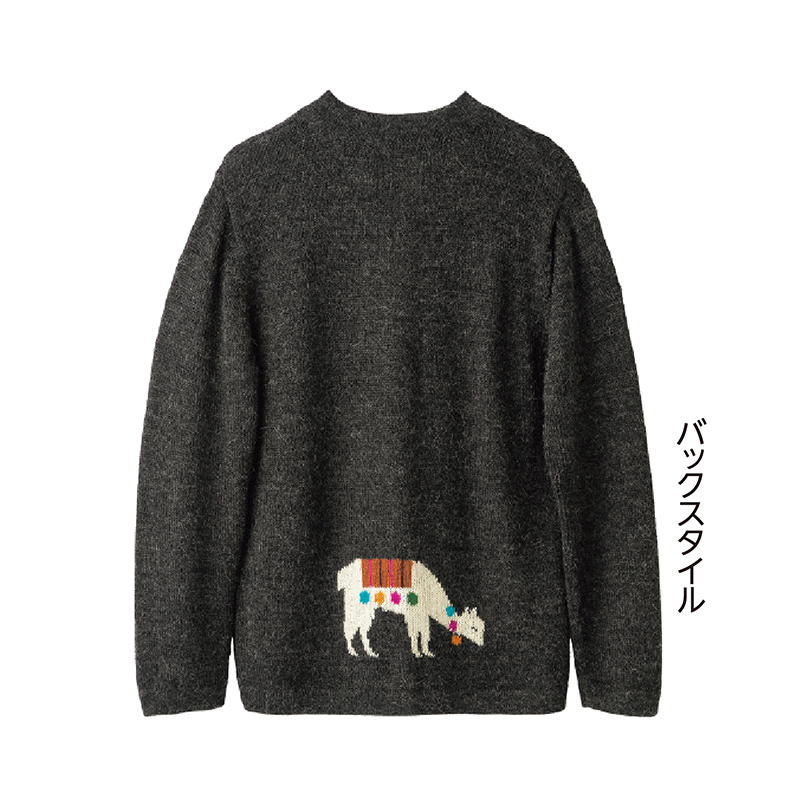 今年もアルパカの季節がやってきます。着飾った向かい合う二頭が目を惹きます。 二頭のアルパカが草を食むのどかな光景を表現。後ろ身頃にももう一頭と、見る方を楽しませます。アルパカ100%の暖かさ。ペルー生まれの一着です。 ●カラー:チャコールグレー系 ●重量(約):400g(L) ●素材:アルパカ100% ●仕様:前ボタン(M・L=6個、LL=7個) ●ドライクリーニング可 ●ペルー製 ※商品の性格上、一点一点柄の出方や仕上がり寸法等が多少異なります。