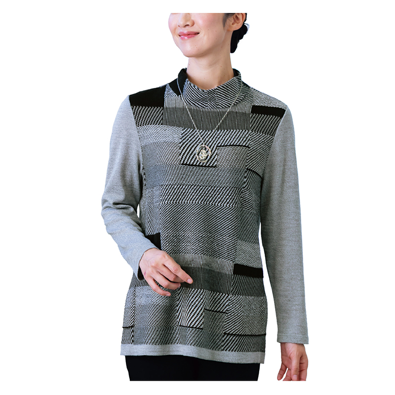 モノトーンのブロック柄で、上品に、美しく。 杢糸使いの高級感ある、落ち着いた色合い。ブロック柄をジャカードで編み上げ、おしゃれに。裾にかけてのAラインがさりげなく体型をカバーします。 ●カラー:グレー系 ●素材:アクリル58%、ポリエステル16%、レーヨン8%、ナイロン7%、毛6%、綿5% ●ドライクリーニング可 ●日本製 ※アクセサリーは付属しません。 ※商品の性格上、一点一点柄の出方や仕上がり寸法等が多少異なります。