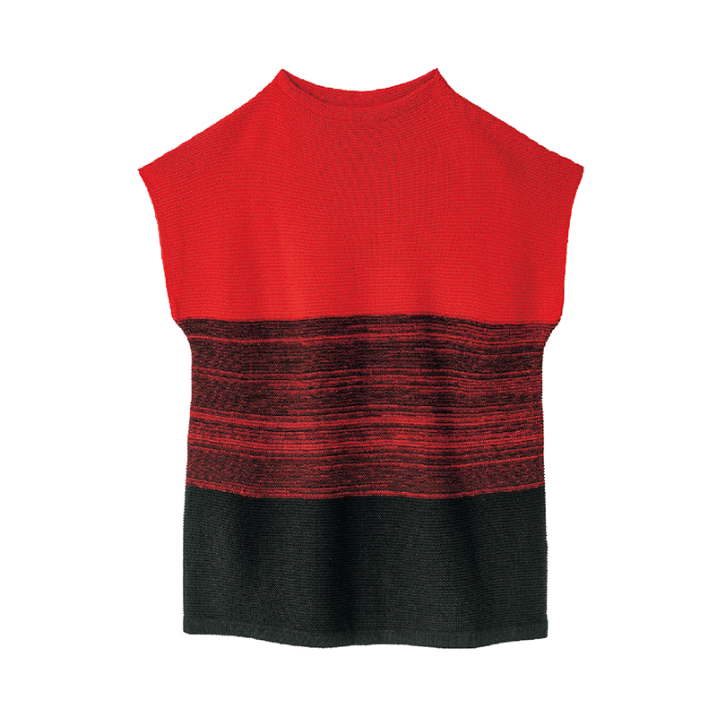 2色のコントラストに魅了される。モダンな印象のチュニックベスト。 ブラックとレッドで魅せる、軽くて暖かなウール混のチュニックベスト。ガーター編みの凸凹感で、表情豊かに。肩を覆うデザインとボトルネック風の襟で、すっきり着こなせます。 ●カラー:レッド×ブラック ●素材:アクリル70%、毛30% ●手洗い可 ●日本製 ※インナー、アクセサリーは付属しません。 ※商品の性格上、一点一点柄の出方が多少異なる場合があります。