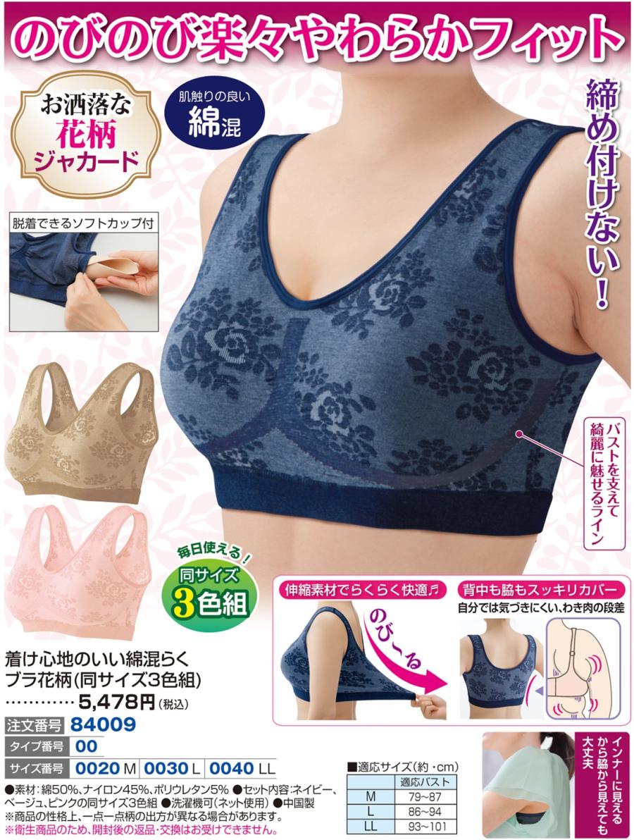 着け心地のいい綿混らくブラ花柄(同サイズ3色組)