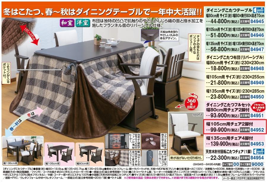 幅105cm用チェア2脚付/ダイニングこたつフルセット