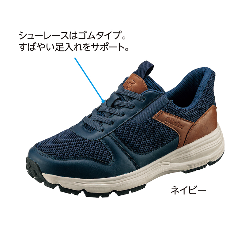 スッと履ける。サッと歩き出せる。幅広4E相当のゆったり快適設計。 独特のかかと構造とゴム紐仕様でスッと履ける、便利な楽インスニーカー。日本人の足に合わせた幅広4E相当設計で履き心地もゆったり。高さ約4cm4時間防水設計で多少の雨でも安心です。 ●ワイズ:4E相当 ●重量(約):330g(26.0cm・片足) ●材質:アッパー=合成繊維、合成皮革/ソール=合成底 ●中国製
