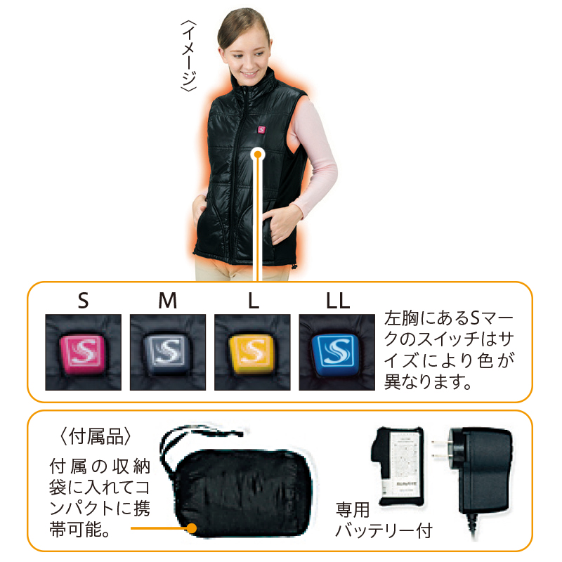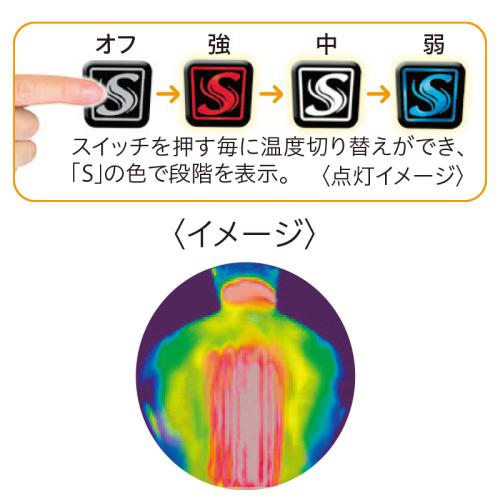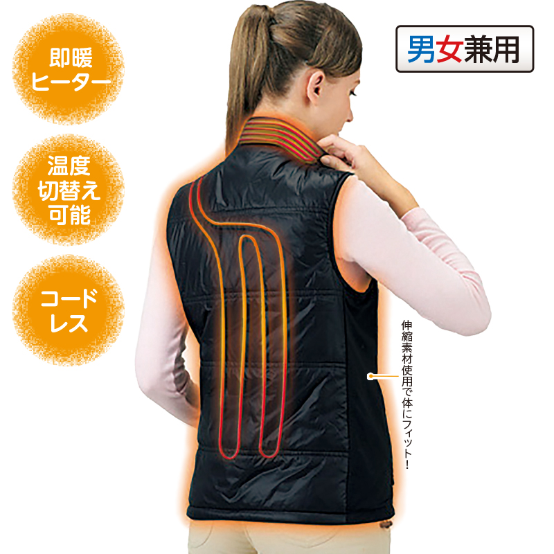 「着るヒーター」で寒い屋外でもポッカポカ。 首筋と背中にしなやかな日本製マイクロカーボンファイバーヒーターを内蔵。約10秒で暖まり、さらに遠赤外線効果で全体へと温もりが広がります。インナーにもアウターにも使用OK。 ●カラー:ブラック ●重量(約):本体=300g(M)/バッテリー=100g ●素材:表地・裏地=ナイロン100%/脇=ポリエステル92%、ポリウレタン8%/腕周り=ナイロン89%、ポリウレタン11%/中わた=ポリエステル100%/ヒーター=炭素繊維 ●電源:リチウムイオン充電池 ●充電時間(約):2.5時間 ●連続発熱時間(約):最大7時間 ●仕様:温度3段階調節、前ファスナー全開、両脇ファスナーポケット、ファスナー内ポケット×1(内部にバッテリー用ポケット、バッテリー接続プラグ) ●付属品:充電式バッテリー、充電用ACアダプター(コード長さ=1.5m)、収納袋 ●手洗い可 ●中国製 ※充電状況や地域・気温などの使用環境により発熱時間は変動します。 ※通電後の返品・交換はお受けできません。