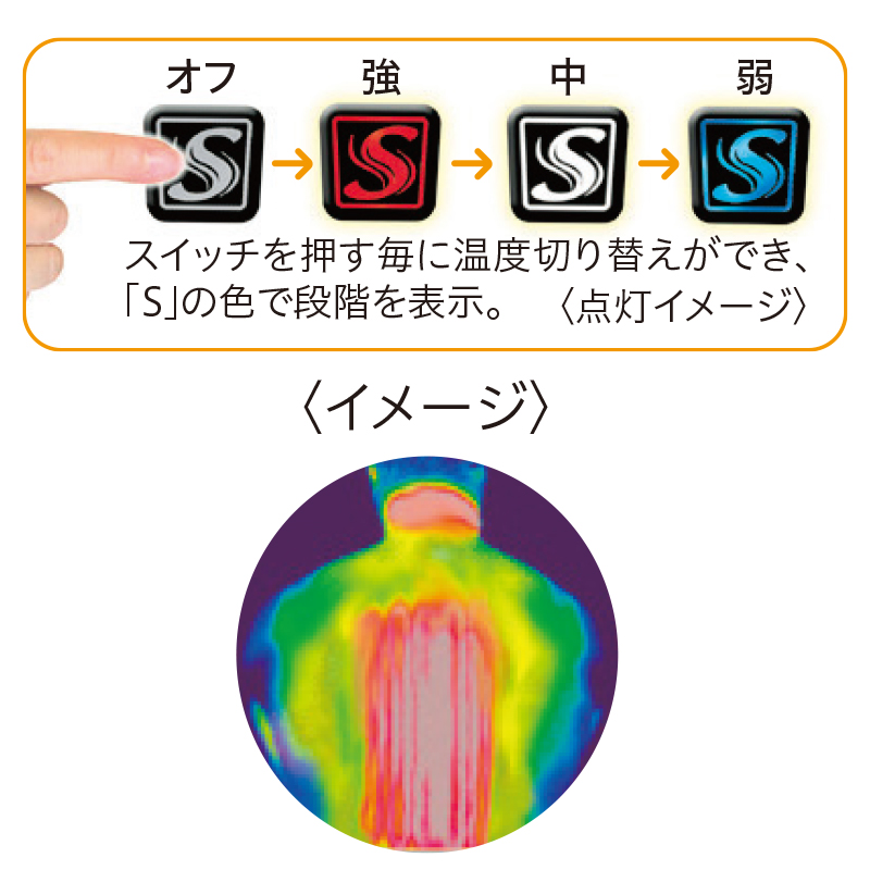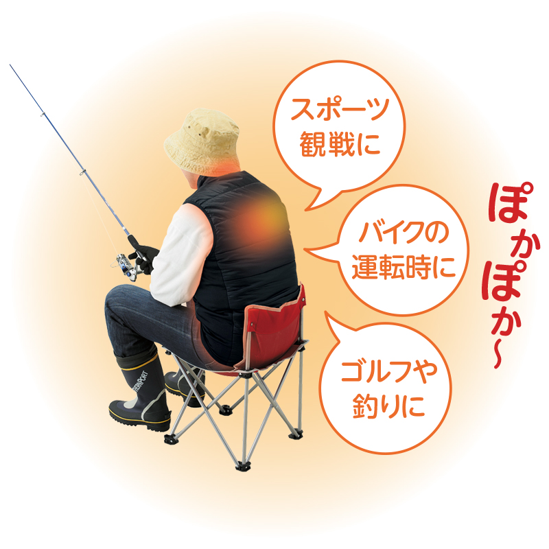 背中と首元に内蔵のヒーターがじんわりと温めます。
