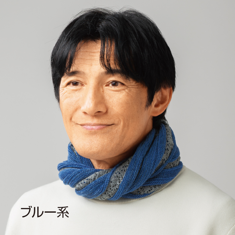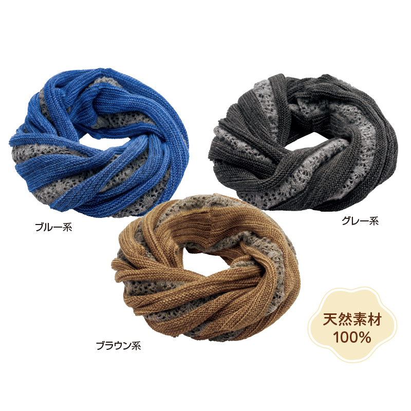 被るだけで形が決まり首元を暖かく彩ります。 異なる色のウール、コットン、シルクを使ったガーター編みと透かし編みで深みのある色調を表現。柔らかな肌触りで伸縮性があり、着脱も簡単です。 ●サイズ(約):内周=50~60cm ●重量(約):75g ●素材:毛45%、絹40%、綿15% ●手洗い可 ●日本製 ※商品の性格上、一点一点サイズや色合い等が異なります。