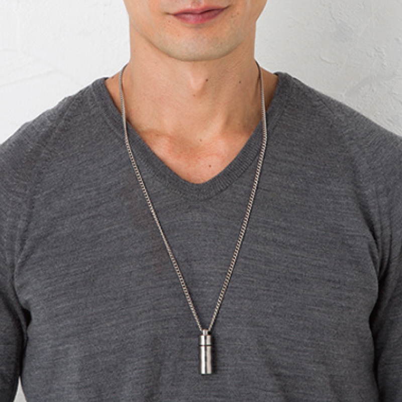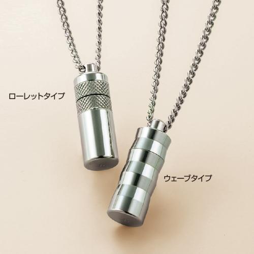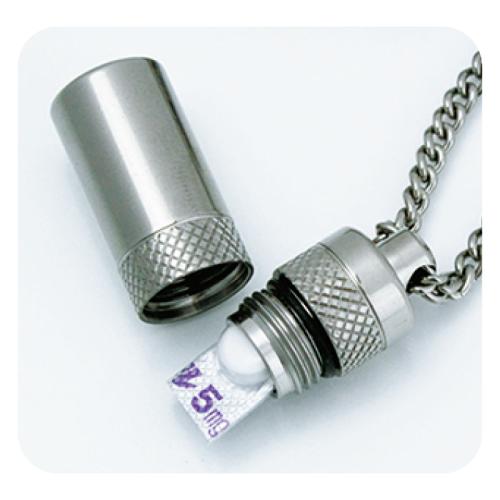 常備薬や緊急時のお薬など大切な物を持ち歩ける、軽くてお洒落な純チタン製ネックレス。 ものづくりの町・新潟県は燕・三条地域の伝統の金属加工技術が生んだ、肌身離さず身に付けられるアクセサリー兼錠剤入れ。純チタンは肌にやさしく、海水や温泉水でも錆びずに変色しにくい特長があります。チェーンも純チタンで、長さは余裕の約70cm。頭からすっぽり掛け外しできるので、万が一の時も安心です。 ●サイズ(約):カプセル=外径1.3×高さ3.3cm、内径0.8×高さ2.9cm/チェーン長さ=70cm ●重量(チェーン含む・約):ローレットタイプ=18g/ウェーブタイプ=19g ●材質:カプセル・チェーン=純チタン/ゴム部分=ニトリルゴム ●付属品:ゴムリング(予備)×1 ●日本製 ※ご使用後の返品・交換はお受けできません。