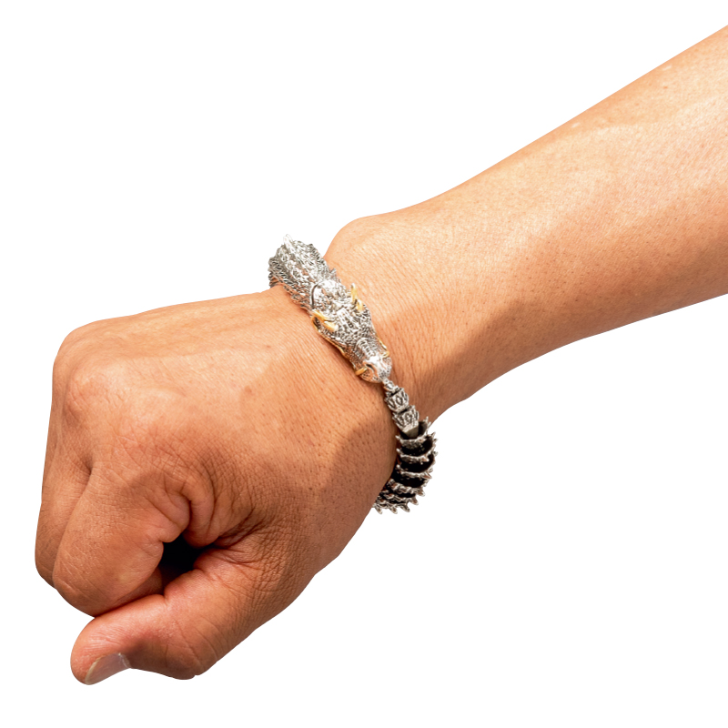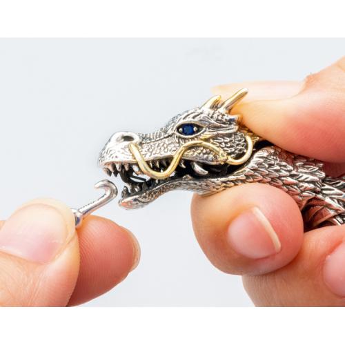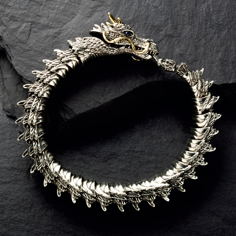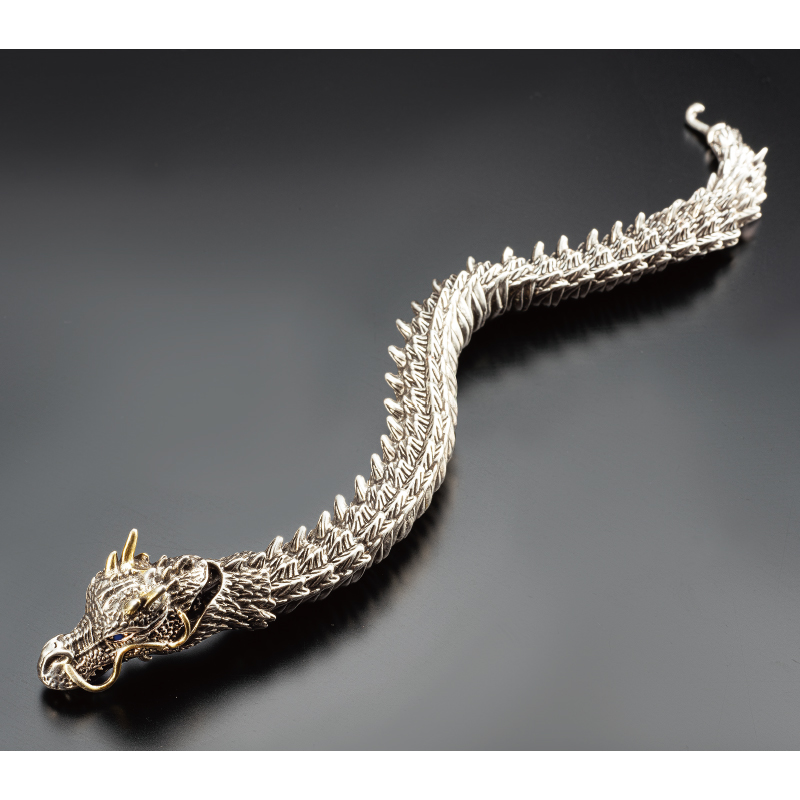 昇龍ブレスで家運隆盛・運気上昇を願う。 生命力に満ちあふれ、天に向かい駆け昇る龍のブレスレット。収縮するので脱着は簡単。オブジェとして飾ることもできます。 ●サイズ(約):内周=19cm ●重量(約):85g ●材質:本体=亜鉛合金、オペロンゴム/眼=ガラス ●中国製