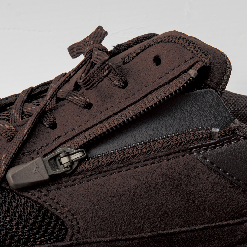 内側サイドファスナーで、いちいち紐を結んだりほどいたりしなくても着脱簡単。