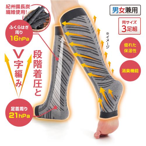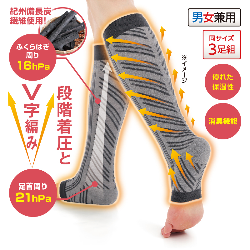 紀州備長炭繊維使用! 着圧設計+保温でむくみスッキリ。 段階着圧で血液とリンパの流れを促進。医療機器に認証されたサポーターです。備長炭繊維による優れた保温性と消臭効果もプラスしました。 ●カラー:グレー ●素材:ナイロン、綿、ポリエステル、レーヨン、ポリウレタン ●一般医療機器届出番号:29B3X10003000058 ●手洗い可 ●日本製 ※ご使用後の返品・交換はお受けできません。