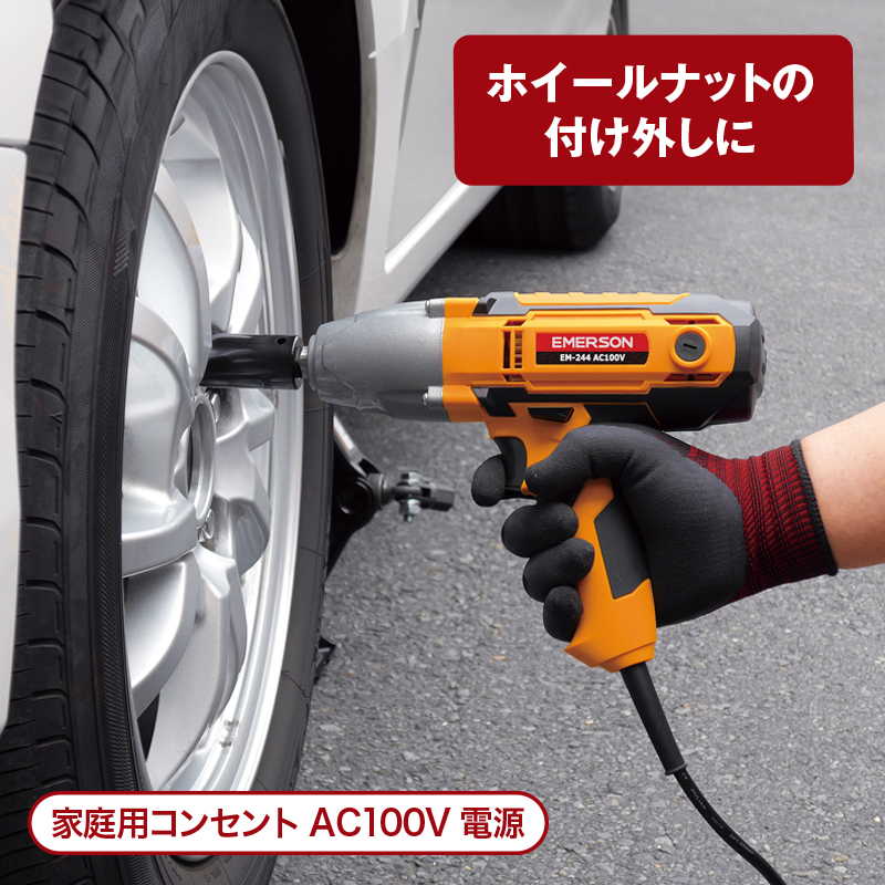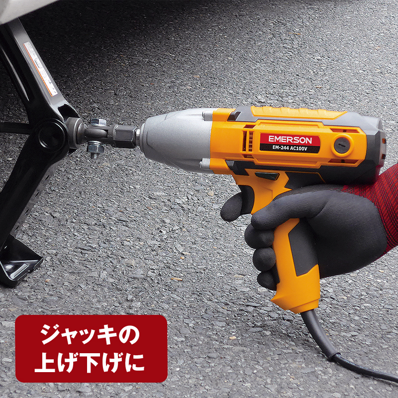 ナットの付け外し、ジャッキの上げ下げ、どちらも使えるハイブリッドなレンチ。 自宅でのタイヤ交換作業を楽にする電動レンチ。ボルトを傷める心配がない安全締付機構。国産車対応のアダプターでジャッキを電動化できます。 ●サイズ(約):幅7.4×奥行27.3×高さ20.3cm/電源コード長さ=2m ●重量(約):2.1kg ●材質:本体=強化ナイロン、アルミニウム、スチール、クロムバナジウム鋼/専用ケース=ポリエチレン ●電源:AC100V ●消費電力:450W ●連続使用時間(約):10分 ●仕様:回転数=0~3200min-1/最大トルク=緩め時300Nm、締め時120Nm/打撃数=0~4200min-1/絶縁方法=二重絶縁/締め付け能力=M10~M14 ●付属品:19mm・21mmロングソケット(差込角1/2DR 12.7mm)、ジャッキヘルパーAタイプ・Bタイプ、ボルト×2、ナット×2、ワッシャー×4、スプリングワッシャー×2、スペアカーボンブラシ×2、専用ケース ●中国製 ※ご使用後は別途、トルクレンチで適正トルクの確認を行ってください。 ※純正車載パンタジャッキ(一部を除く)に対応します。 ※機械式ボトルジャッキには使用できません。 ※ご使用後の返品・交換はお受けできません。
